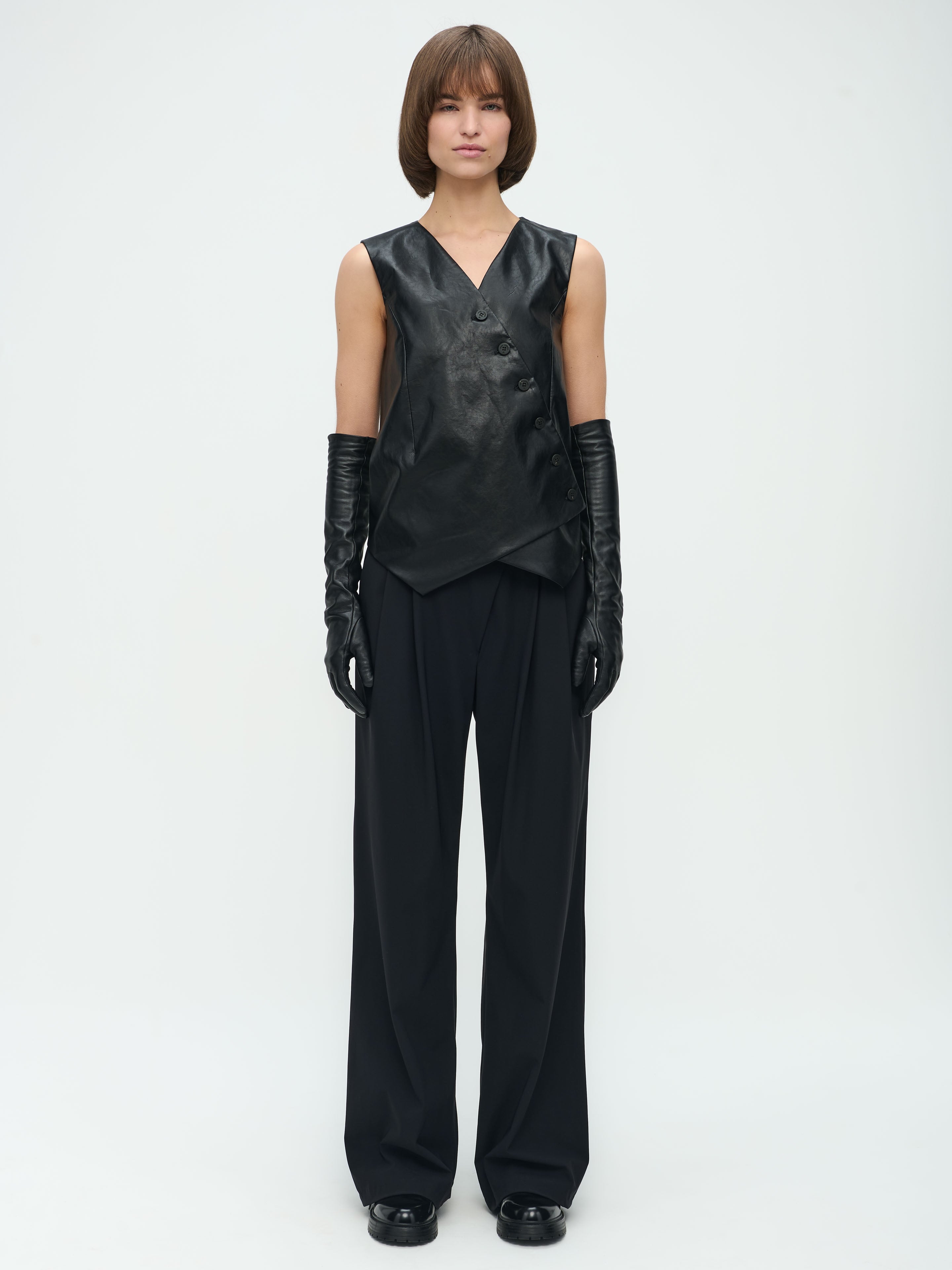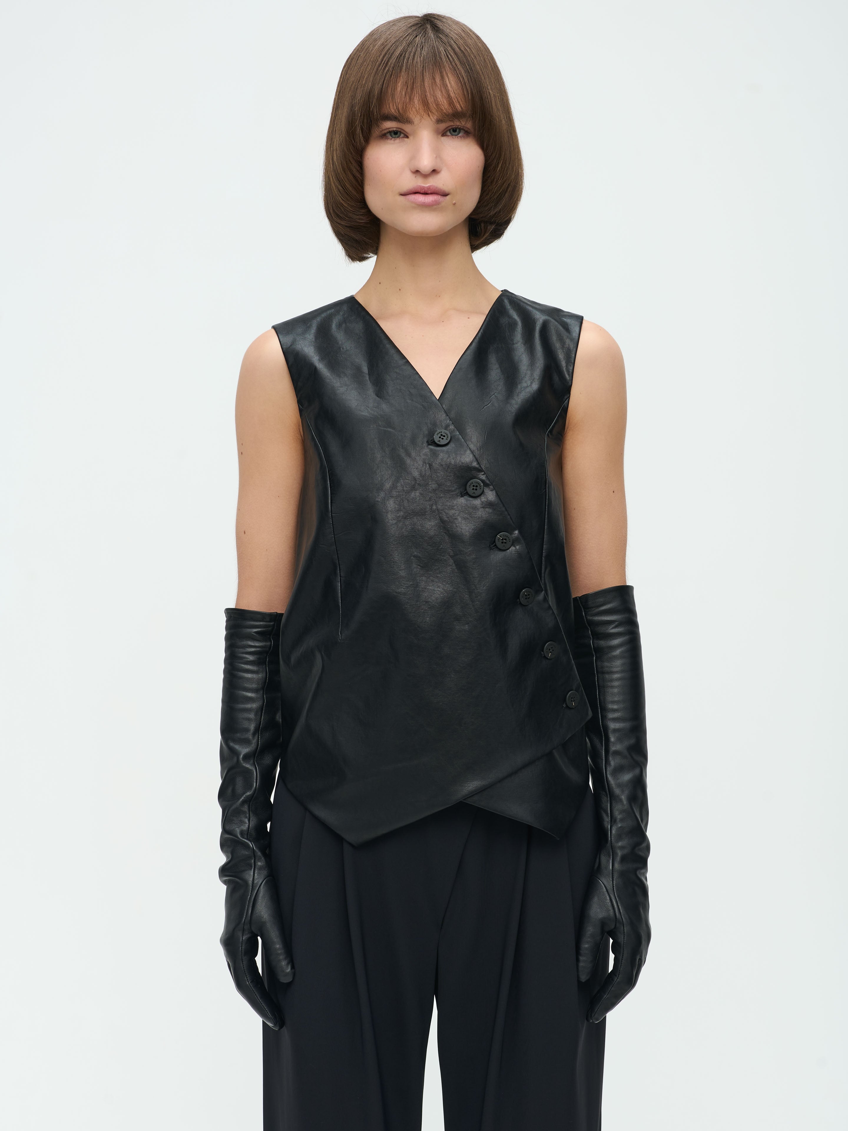 Oliver Leather Vest: Step up your style game with the Oliver Leather Vest, made from luxurious viscose leather. This regular-fit vest features an eye-catching asymmetrical front fastening, adding a modern twist to a classic piece. Ideal for creating a bold, sophisticated look.
