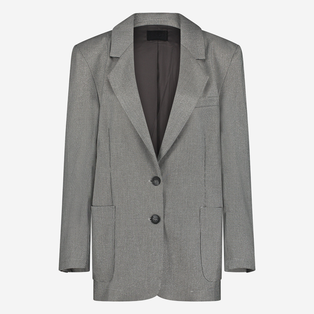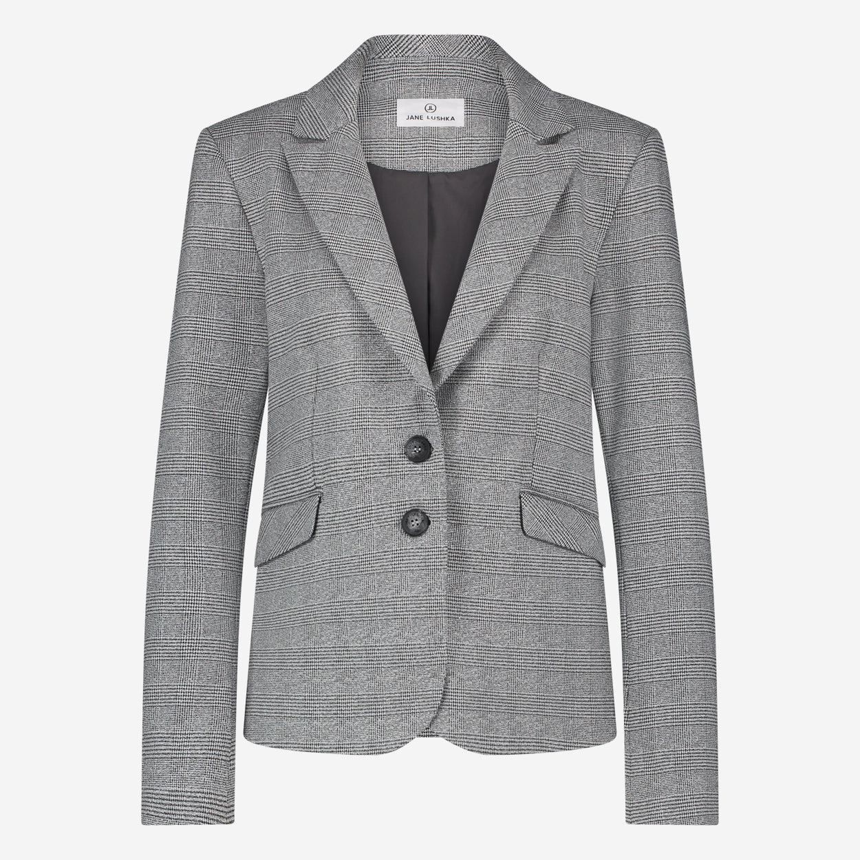 Hetty Blazer: Elevate your style with the Hetty Blazer, expertly tailored from a poly viscose blend featuring a refined check structure. Flaunting a sleek silhouette, it's the epitome of sophistication for any occasion. The model is 1,79 cm tall and wearing size S.