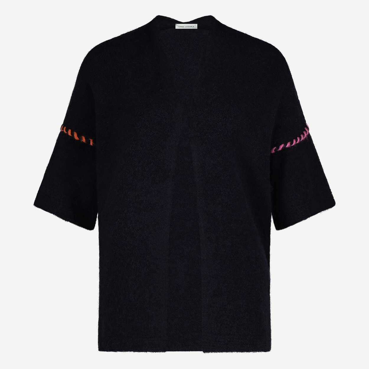 Vest 2202A6: Elevate your layering options with this knitted open cardigan, a unique blend of style and craftsmanship. Featuring hand-made details on the sleeves, this cardigan adds a touch of artisanal charm to your ensemble. Its open design allows for versatile styling, making it perfect for transitioning through seasons or adding an elegant layer to any outfit.
