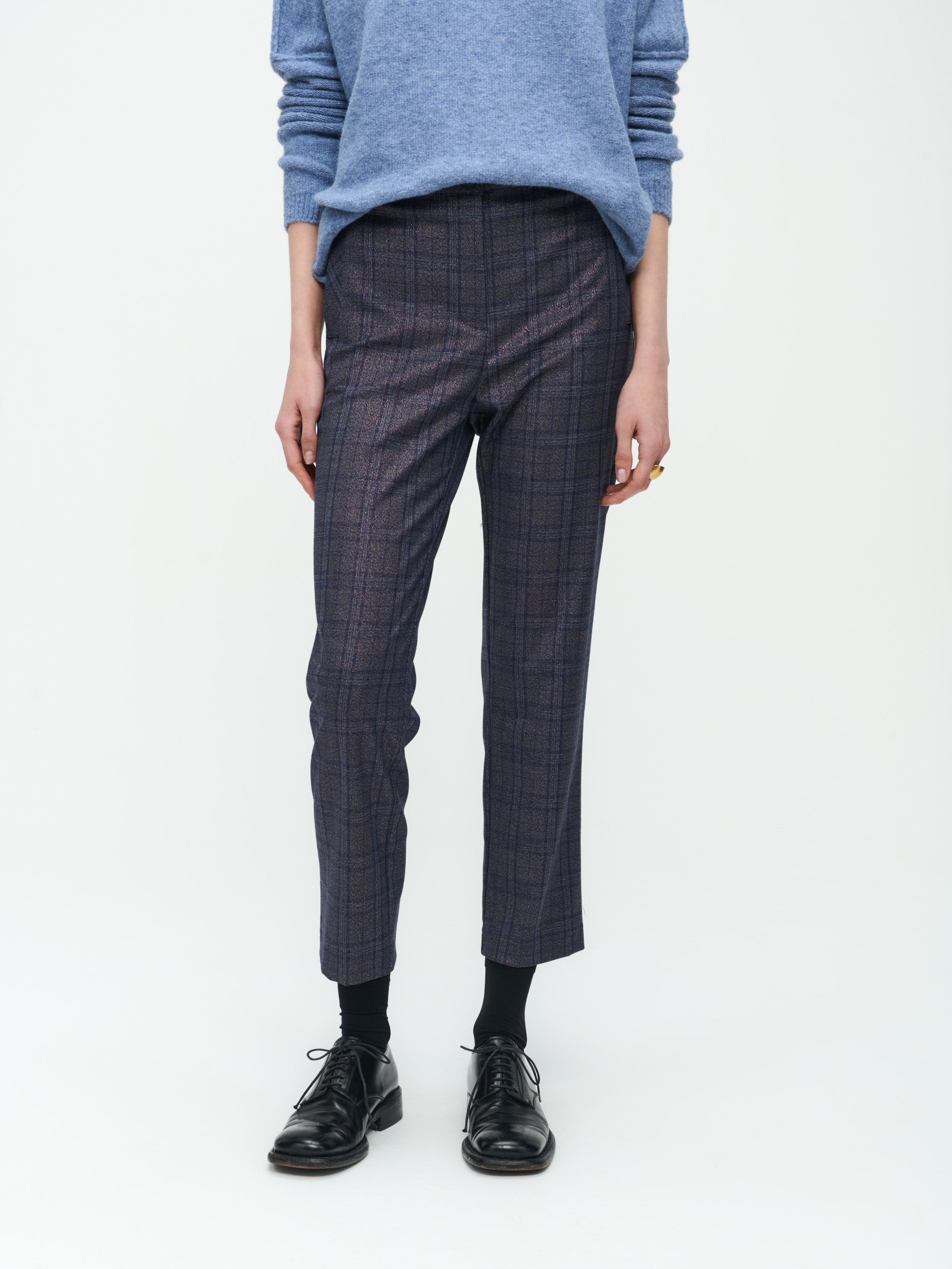 Mirel Pants: Dive into elegance with our poly viscose pants boasting a captivating check shiny structure, adding a touch of glamour to your look.