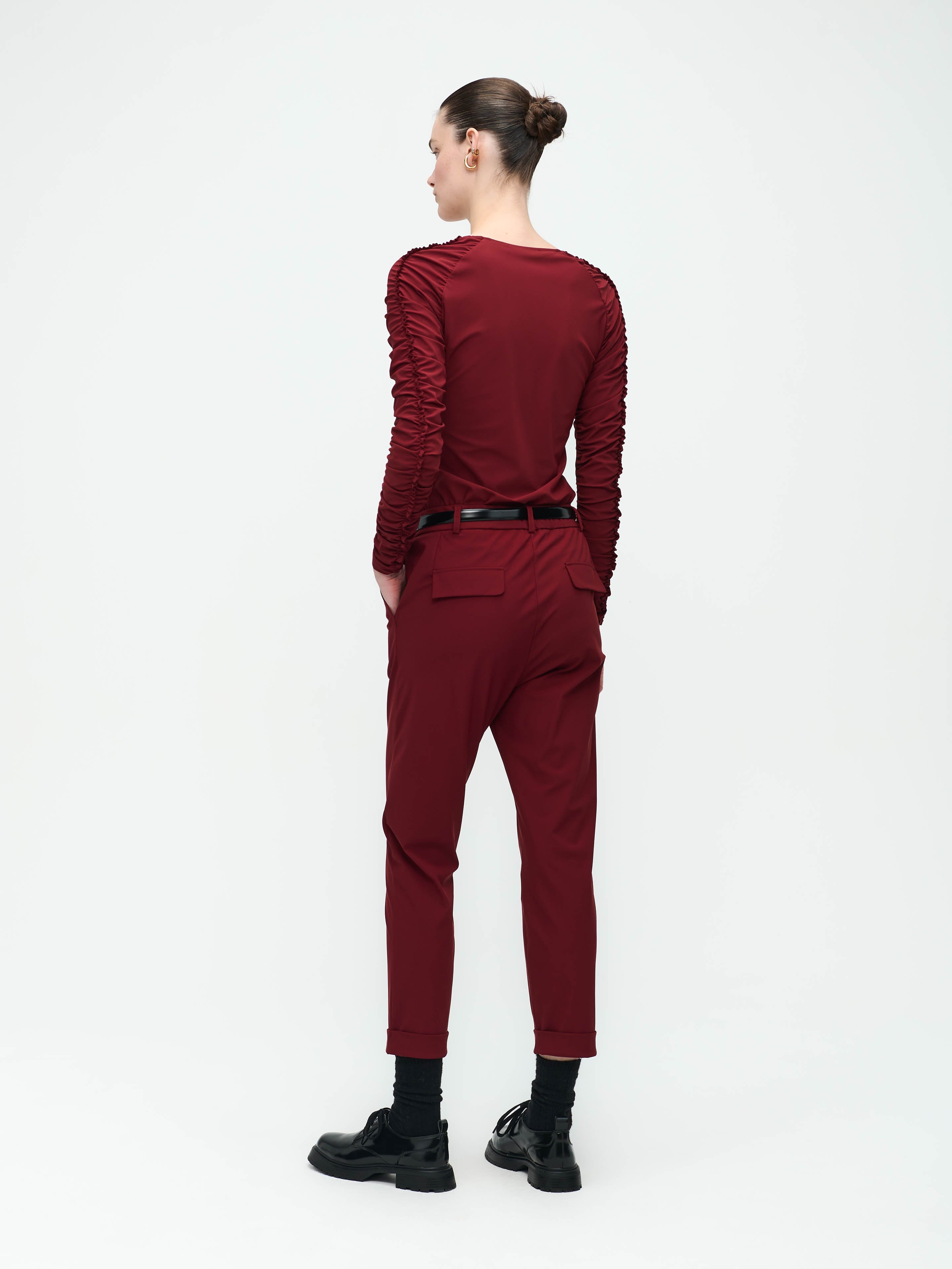 The Gary Pants are crafted from high-tech stretchy material, featuring an elastic band and tapered legs. These pants offer a comfortable fit with a sleek, modern silhouette.